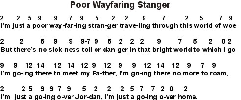 The following tabs can be used for any single string of any instrument that has a scale similar to guitar, banjo, etc. The numbers above the lyrics refer to the fret to produce that particluar note - 0 means open string. I've done my best but feel free to make any changes that suit you. Click here for a PDF version you can download and print. The PDF version only has 4 songs but it prints out on regular 8.5" x 11" paper. ![]()